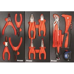 Module réf.09876 (4pcs) • 4 pinces circlips Module réf.09877 (4pcs) • 1 pince universelle 180mm • 1 pince droite bec ½ rond 160mm • 1 pince coudée bec ½ rond 160mm • 1 pince coupante Module réf.09878 (4pcs) •1 tenaille russe 220mm •1 pince à riveter compacte •1 pince multiprise classique •1 mètre ruban 3M x 16mm,